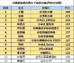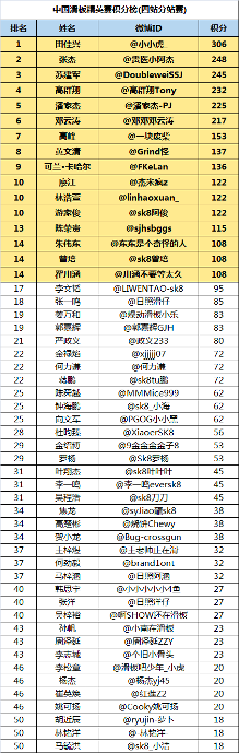专业男子组、女子组选手分站赛总积分排行榜情况如下: