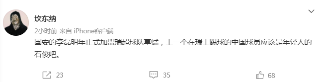 该博主写道:“国安的李磊明年正式加盟瑞超球队草蜢,上一个在瑞士踢球的中国球员应该是年轻人的石俊吧。 ”