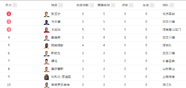 [体育] 中超射手榜:张玉宁6球领跑 卡兰加等3外援进5球