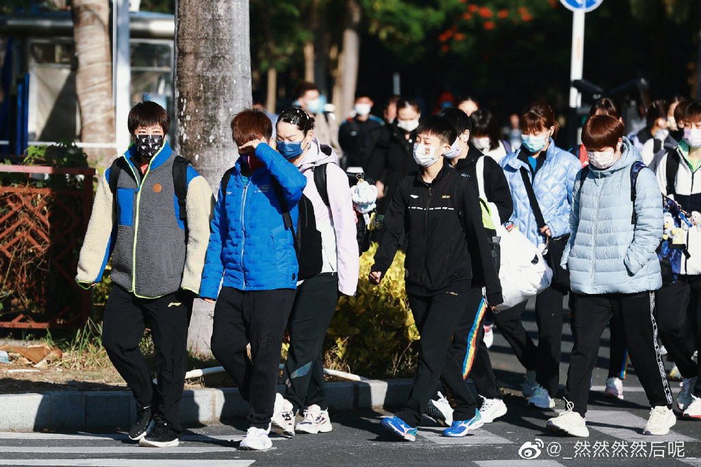 为了备战新赛季,在乒超联赛结束之后,国乒就从威海直接转战海南开启冬训。由于陵水训练场地有限,部分队员前往海口训练,主力队员则在陵水进行封闭训练。由于一月初国乒就将外出比赛,除了上下午的训练,队伍还增加了晚训。每次去训练的时候,男女队的画风大不相同,男队员们三三两两,单独前往训练馆,而女队员们大多数时候都是排着队,一起前往训练馆。女队主教练李隼、女一队教练组组长马琳、教练邱贻可以及体能教练王翔分散在队伍四周,护送着队员们前去训练。