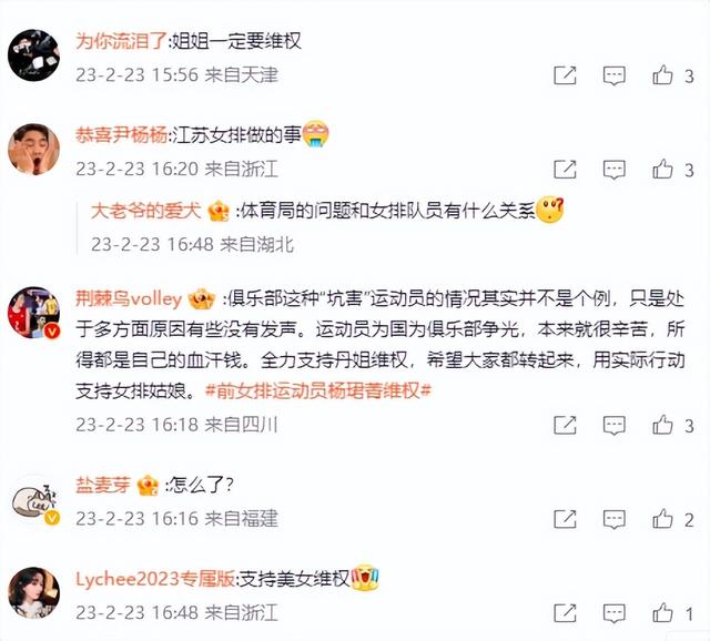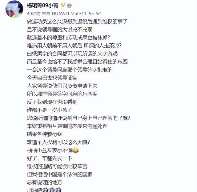 日前,前中国女排副攻、世界冠军杨珺菁发文维权一事不断在网络上发酵。网友对此议论纷纷,绝大多数球迷力挺杨珺菁,认为她应坚持到底,维护自身权益。同时,也有不少球迷在网络平台呼吁更多的有着相同经历的球员站出来发声,同相关“领导”作斗争。从杨珺菁发布的这条动态内容来看,她表示,自己做运动员这么长时间,但没想到退役后竟会遇到维权的事。