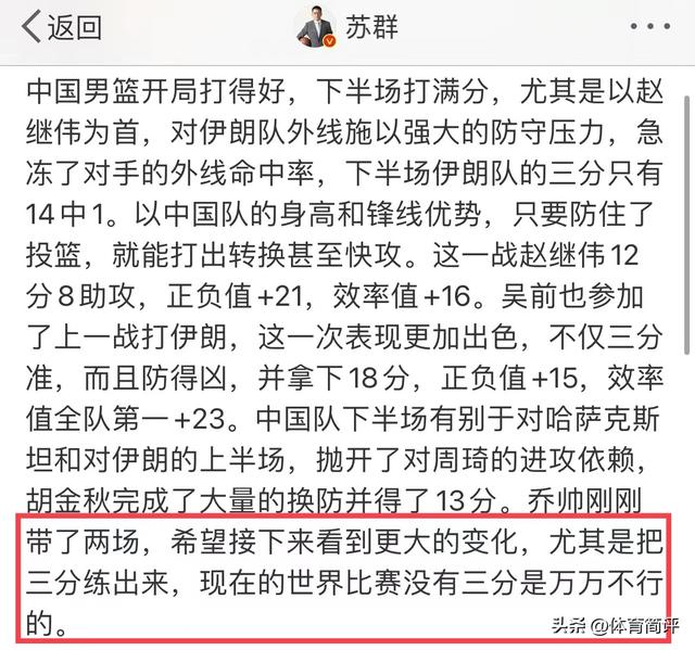 本届世亚预赛,中国男篮在克服伤病的情况下,凭借10胜2负佳绩,携手同组的澳大利亚男篮、日本男篮以及伊朗男篮晋级正赛。赛后,苏群老师第一时间在个人社交账号中点评了中国男篮与伊朗男篮的比赛,主要谈及三点: