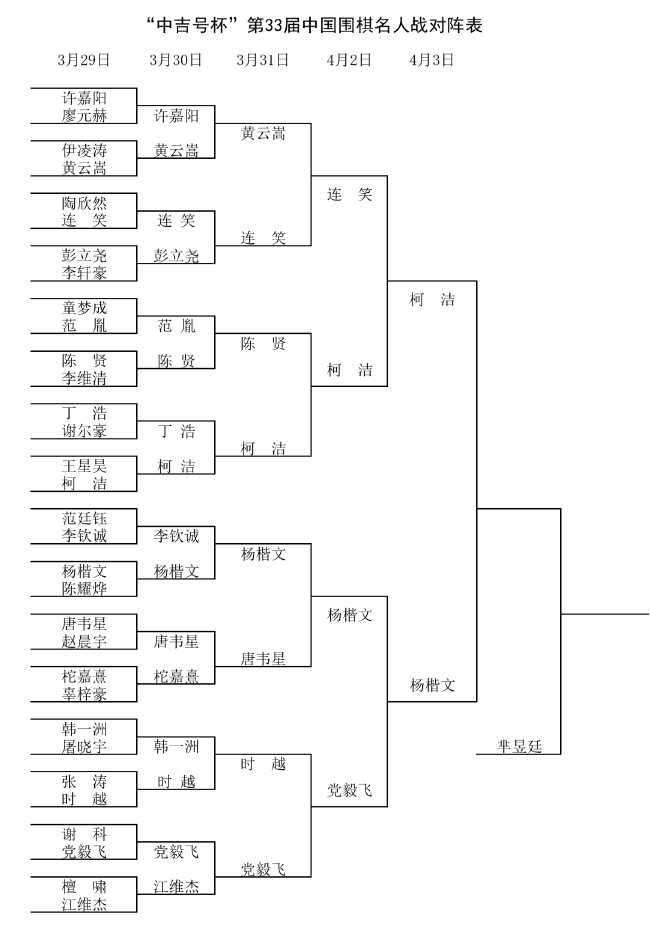 4月2日,“中吉号杯”第33届中国围棋名人战半决赛在深圳市龙华区进行,结果八冠王柯洁击败曾经三届名人头衔得主连笑,杨楷文击败世界冠军党毅飞完成对后者的首胜。这样,柯洁、杨楷文晋级本赛决赛,将争夺本届名人战的挑战权。决赛将于3日12时30分进行,敬请关注! (佳佳)
