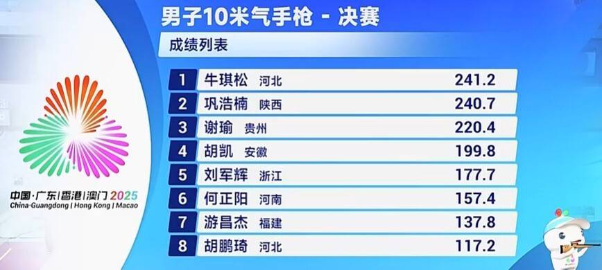 10月15日,第十五届全运会射击男子10米气手枪决赛进行。巴黎奥运会该项目金牌得主谢瑜,在关键时刻失误仅仅获得铜牌,今年在世界杯取得四连冠的胡凯无缘领奖台,河北选手牛琪松稳健发挥夺金,陕西队的巩浩楠获得银牌。