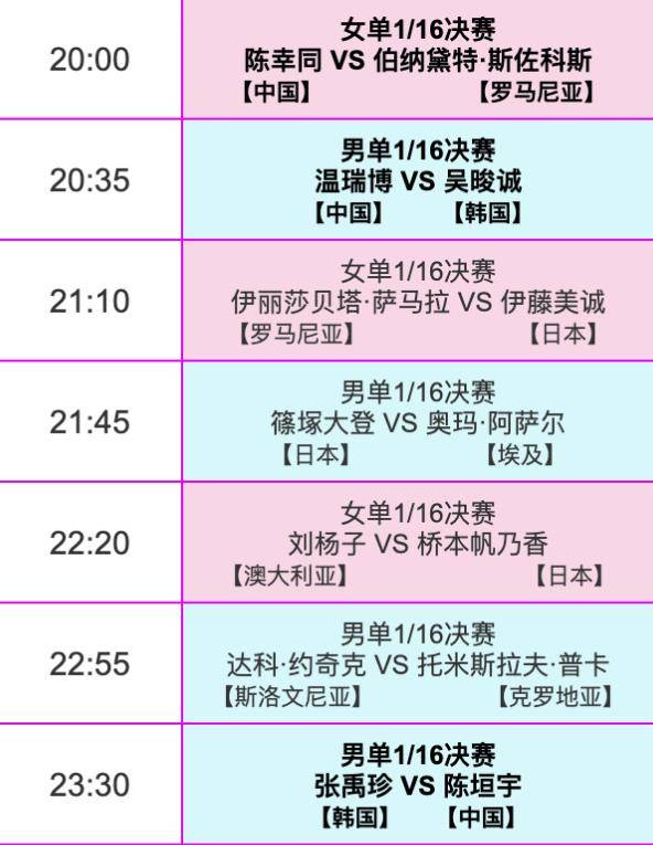 次日凌晨1点30分,林昀儒迎战法国选手科顿,韩国对阵队友温特,李尚洙对阵安宰贤,郑怡静迎战波尔卡诺娃,F勒布伦对阵格罗特,布鲁娜对阵李恩惠。(知轩体育) |