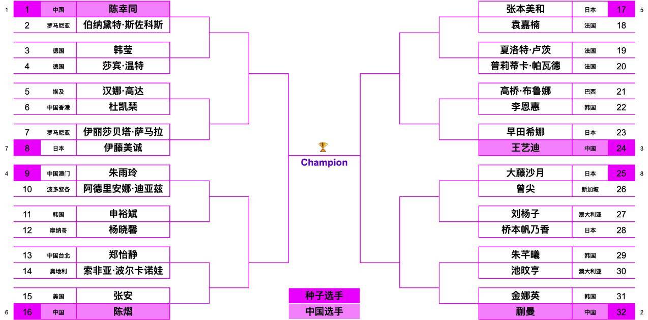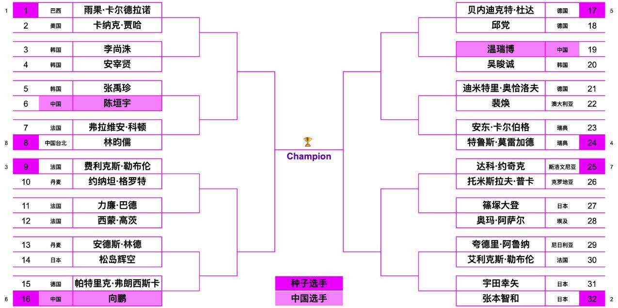国乒男单只有三人参赛,竞争冠军的难度非常大,外协会几乎全部的对手都参加,头号种子雨果、二号种子张本智和都是夺冠大热门,本身冠军赛只有32强,首轮开始基本就属于强强对抗,陈垣宇首轮对阵张禹珍,属于下风球,必须拼出来才有机会,向鹏首轮难度也很大,迎战德国名将弗朗西斯卡,温瑞博迎战韩国小将吴晙诚,也是硬战。