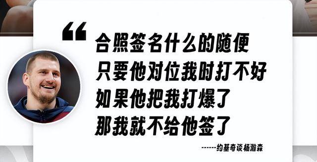 众所周知,杨瀚森早就被外界誉为“中国约基奇”,他选秀时的模板之一就是约基奇,甚至可以说约基奇是杨瀚森的终极模板。在今夏约基奇开启中国行时,他曾经在谈到杨瀚森的NBA前景时,曾经幽默表示“合照签名什么的随便,只要他对位我时打不好。如果他把我打爆了,那我就不给他签了。”