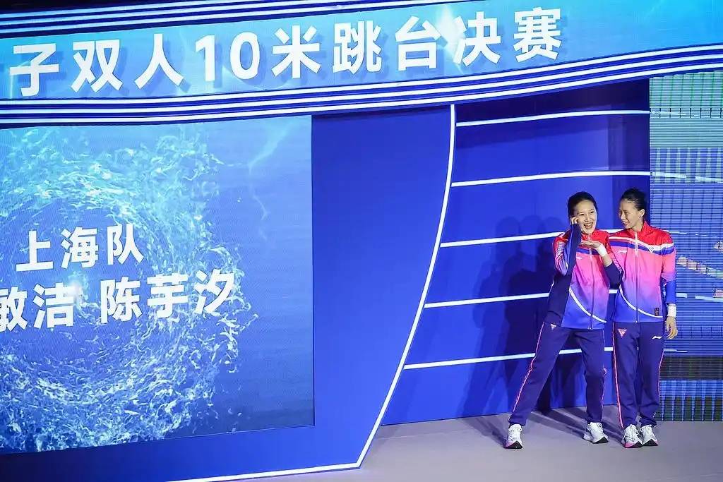 陈芋汐/掌敏洁预赛以339.06分头名晋级,决赛五跳同步性高、水花控制出色,首跳201B获52.20分奠定优势,颁奖环节,陈芋汐俏皮捏吉祥物“乐融融”头顶浪花,成可爱名场面,收获本届的首冠。