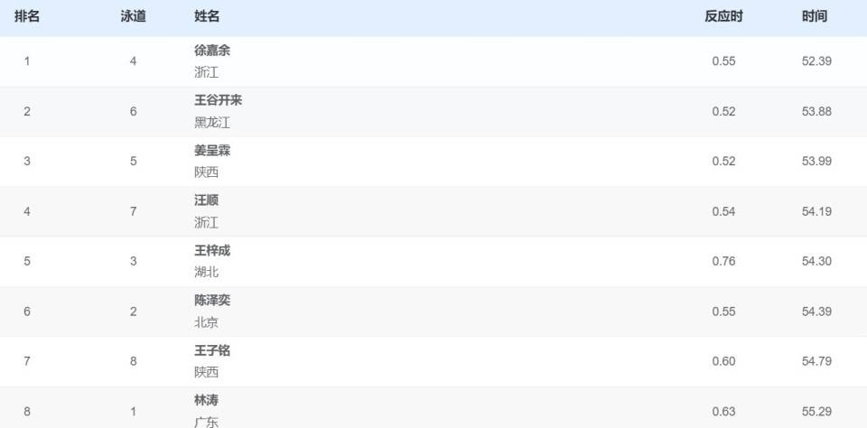 浙江队的徐嘉余以52秒39的成绩成功夺金,黑龙江队的王谷开来53秒88获得银牌,陕西队选手姜呈霖53秒99获得了铜牌。(全景体育) |