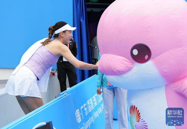 ↑ 广东队选手王欣瑜在比赛结束后与吉祥物“乐融融”互动。 新华社记者 颜麟蕴 摄