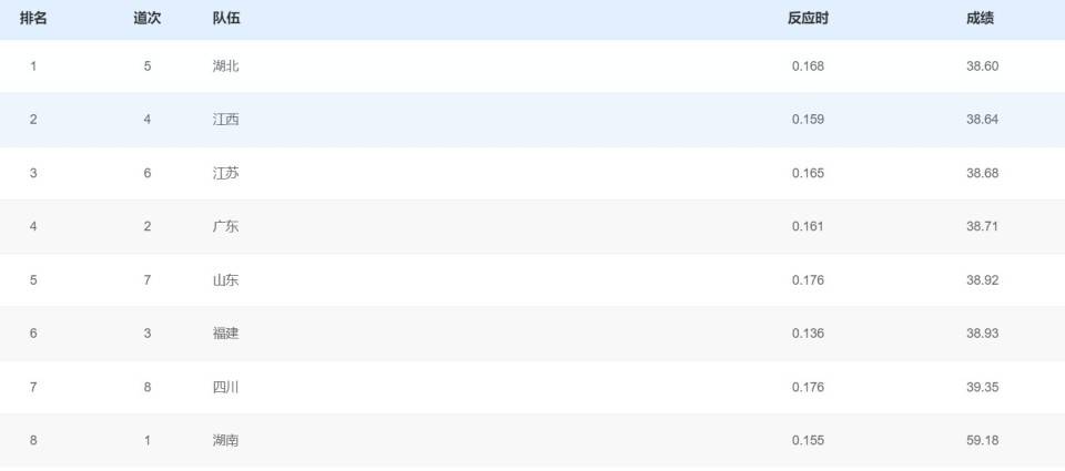 湖北队以38秒60的成绩获得了男子4×100米接力金牌,江西队以38分64的成绩获得银牌,江苏队38秒68获得铜牌,广东队38秒71获得第4名。(全景体育) |