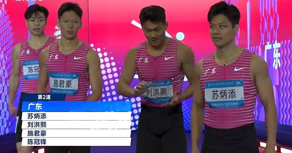 预赛广东队并没有派出苏炳添参赛,他们以小组第3的身份惊险递补晋级决赛。来到决赛的广东队4个棒次分别为苏炳添、刘洪熙、施君豪和陈冠锋。