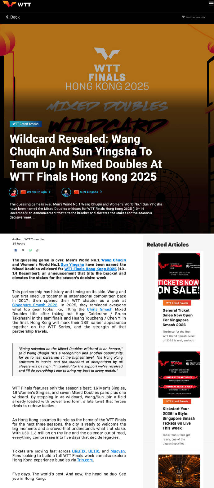 WTT香港总决赛混双外卡悬念揭晓,国乒成功获得唯一的外卡席位,混双一共有八对组合参赛,前面已经公布了七对入围组合,他们凭借在本年度的出色表现,积分靠前直接入围。