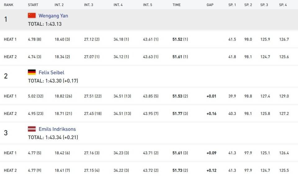 两轮滑行用时相加,闫文港以1分43秒13的成绩成功摘得金牌,领先获得银牌的德国人塞贝尔0.17秒。获得铜牌的是去年冬青奥会冠军、拉脱维亚选手因德利克松斯,成绩为1分43秒34。