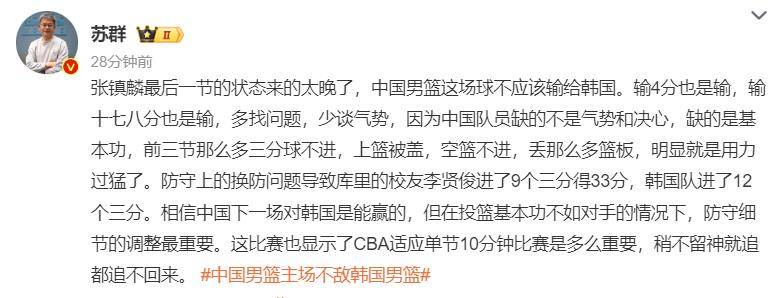 篮球评论员苏群对比赛感到遗憾,在半场过后,就指出三分的问题,中国队只投进一个,攻防都出了比较严重的问题,点出必须要重点防韩国的三分,绝不能以为他们会不准或者体能下降。