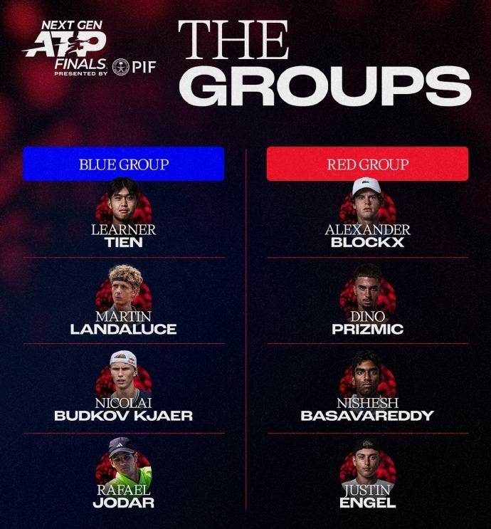 我们再来关注其它消息。北京时间今晨,2025赛季ATP新生力量总决赛(NextGen)举行分组抽签仪式,签表新鲜出炉。被抽到蓝组的四人是头号种子勒纳-钱、4号种子兰达鲁斯、5号种子布德科夫-谢尔和7号种子霍达尔;红组的四名小将是2号种子布洛克斯、3号种子普里兹米奇、6号种子巴萨瓦雷迪和8号种子恩格尔。两个小组将分别进行循环赛,小组前两名晋级四强,然后再进行交叉淘汰赛,获胜的两人争夺最后的冠军。比赛将于12月17--21日在沙特阿拉伯的吉达举行。