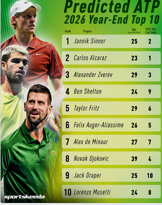 我们再来关注来自外网的消息。最近,有国外媒体对2026年的年终TOP10进行了分析预测,并排出了年终前十的大名单。在这份排行榜上,今年的年终世界第一、第二阿尔卡拉斯和辛纳调换了位置,辛纳重返王座,阿卡退居次席。排在第三位的仍然是德国人小兹维列夫,而今年的年终世界第四、塞尔维亚球王德约科维奇则跌出了TOP5,掉到了第八位,取而代之的是今年排在世界第九位的美国二哥谢尔顿。