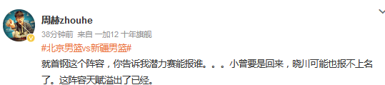 媒体人“周赫zhouhe”发文点评:“就首钢这个阵容,你告诉我潜力赛能报谁。。。小曾要是回来,晓川可能也报不上名了。这阵容天赋溢出了已经。 ”