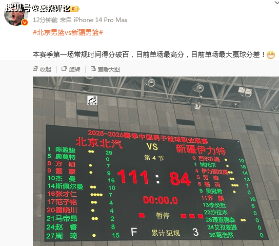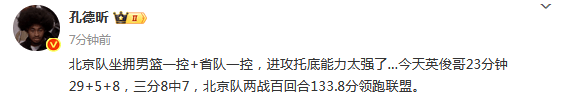 媒体人“孔德昕”发文点评:“北京队坐拥男篮一控+省队一控,进攻托底能力太强了…今天英俊哥23分钟29+5+8,三分8中7,北京队两战百回合133.8分领跑联盟。”
