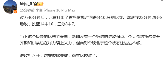 媒体人“盛哲”发文点评:“改为40分钟后,北京打出了首场常规时间得分100+的比赛。陈盈骏22分钟29分8助攻,投篮14中10,三分8中7。