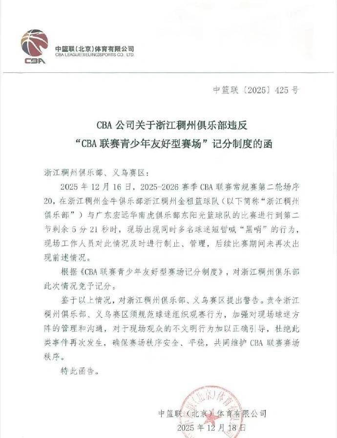 北京时间12月18日,CBA官方发布公告,针对近期在浙江稠州金牛俱乐部主场义乌赛区举行的比赛中,部分球迷大喊“黑哨”的不当行为,对浙江稠州俱乐部及义乌赛区发出警告函,明确要求加强对球迷的管理,规范观赛秩序,保障比赛环境的安全和公平。