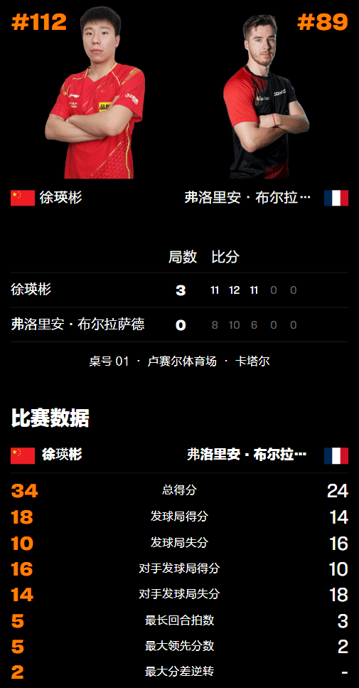 第三局布尔拉萨德退无可退,打出了非常高质量的弧圈球进攻,但失误率也因此而上升,结果全程落后一直在追赶,徐瑛彬则在连赢两局的情况下掌控局面,最终以11-6结束整场比赛,由此而大比分零封对手过关。
