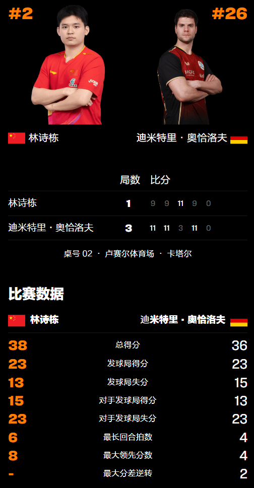 第二局奥恰洛夫先赢4分后被对方追回3球,于是早早用掉了自己的暂停机会。重返赛场后林诗栋未能找回状态,最终以9-11再负,奥恰洛夫由此而连赢两局胜利在望。