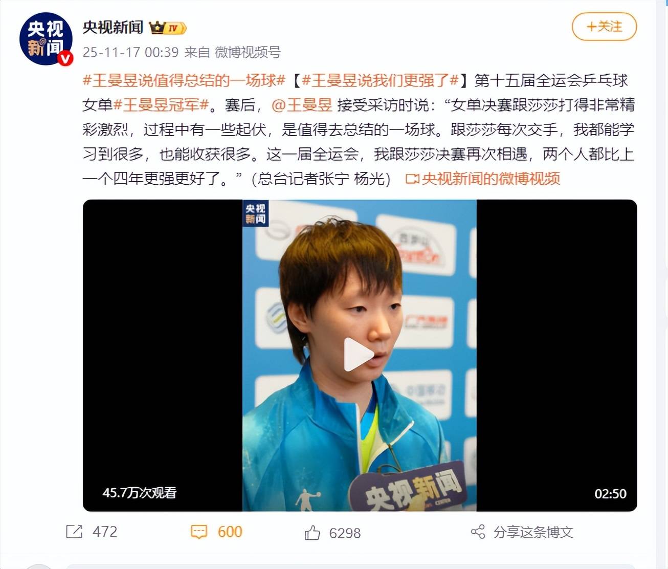 全运会决赛是俩人职业生涯第28次交手,之前孙颖莎18胜10负占优。