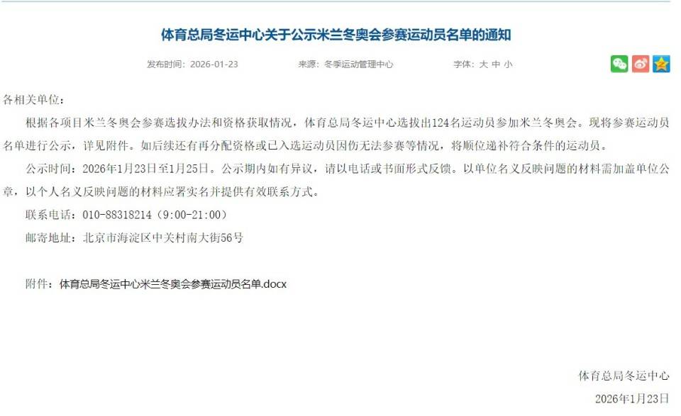 1月23日,国家体育总局冬季运动管理中心发布公告,公示了出战米兰冬奥会的参赛运动员名单。此次米兰冬奥会中国代表团共派出124名运动员参赛,其中男运动员57名、女运动员67名(含替补1男1女)。