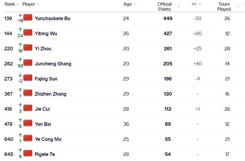 中国选手方面,布云朝克特下降19位来到世界第139,仍旧是中国男网一哥。在澳网闯入第2轮的吴易昺,本周从168升到了144位。周意本周从第238升到了220位,同样有较大幅度提升。商竣程上升56个位次,排名262位重返前300。另一位处在前300的球员,是排名273位的孙发京。(全景体育) |