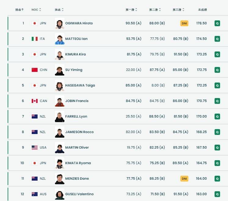苏翊鸣以172.75分的成绩排名预赛所有选手第4位,顺利锁定了一个决赛席位。杨文龙155.75分排名第19位,葛春宇75.75分排名第29位,两人均未能进入到决赛。