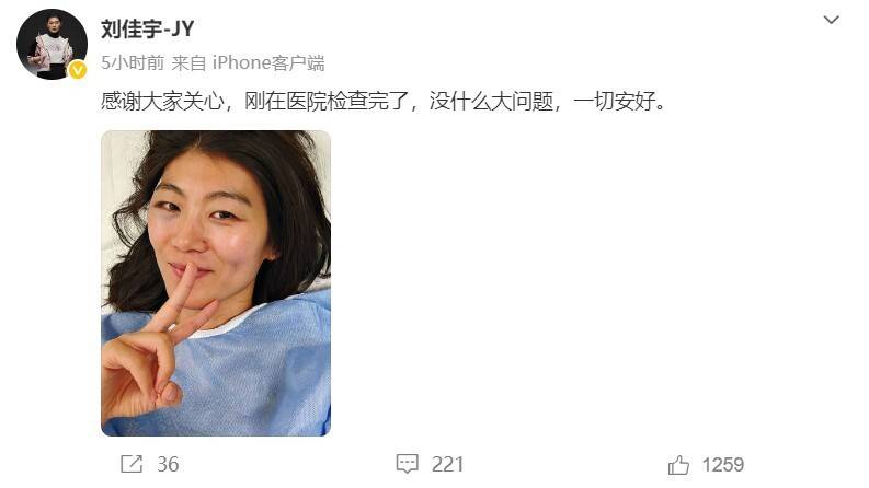 刘佳宇晒出了自己在医院的照片,并配文写道:“感谢大家关心,刚在医院检查完,没什么大问题,一切安好。”
