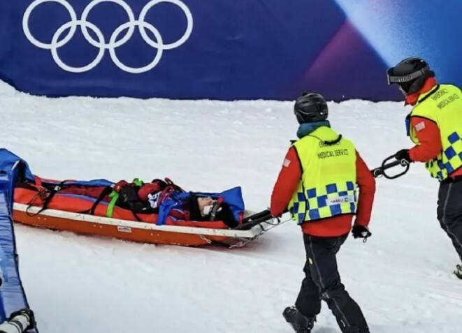 医护人员第一时间进场,对刘佳宇的伤情进行了初步检查。随后刘佳宇被医护人员用雪橇担架固定,带离了比赛现场。