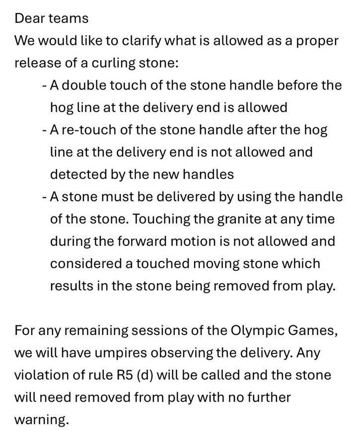 在冬奥会剩余赛程中,我们将安排裁判员监督投掷过程。任何违反R5(d)规则的行为,都将会立即进行判罚,涉事冰壶移出比赛,不再另行警告。