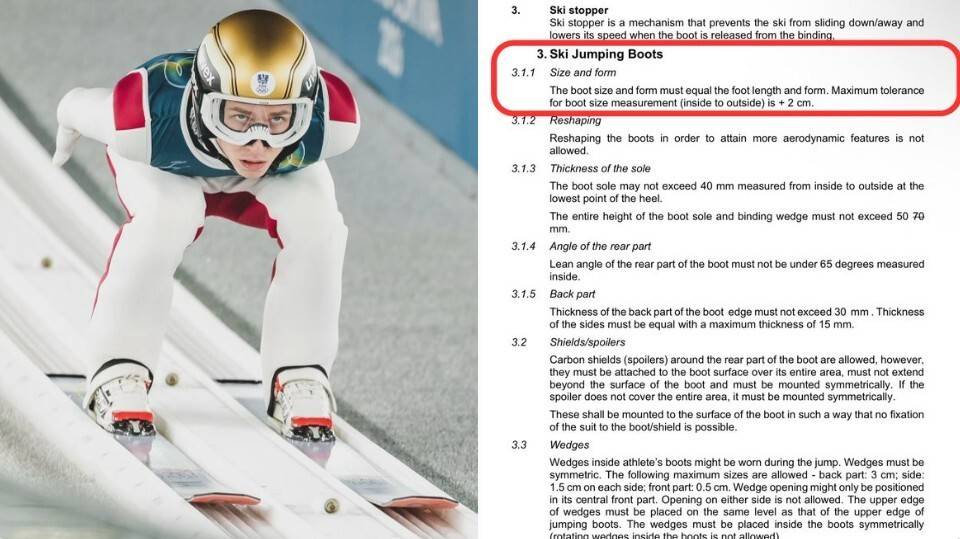 滑雪靴太大的行为,在跳台滑雪中属于装备违规。规则3.1.1条款明确禁止使用超出允许尺寸的鞋具。运动员在跳台滑雪的比赛中,最大允许穿着自己脚长+2厘米的靴子。