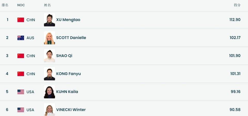 第3位登场的徐梦桃Back Full-Full-Full动作,从起跳高度、空中姿态和落地都一气呵成,完美一跳为徐梦桃拿到了112.90分的成绩。