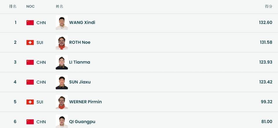 中国选手王心迪以132.60分的成绩收获金牌,瑞士选手诺埃-罗特以131.58分获得了银牌,李天马以123.93分的成绩获得了该项目铜牌。(全景体育) |