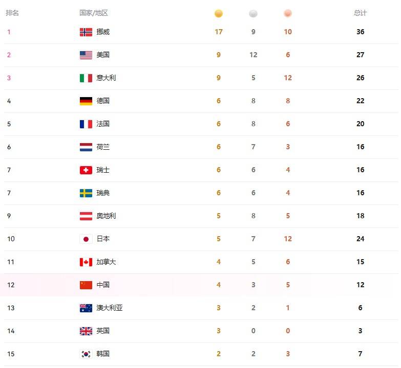 中国队目前4金3银5铜,继续在金牌榜排名第12位,依然有机会去冲击前10,目前第10是日本,5金7银12铜,一共24枚奖牌,从奖牌数看是中国的2倍,挪威以17金高居榜首,而且奖牌数是36枚,还是欧美的天下,前9都是欧美,尤其是欧洲。(知轩体育) |