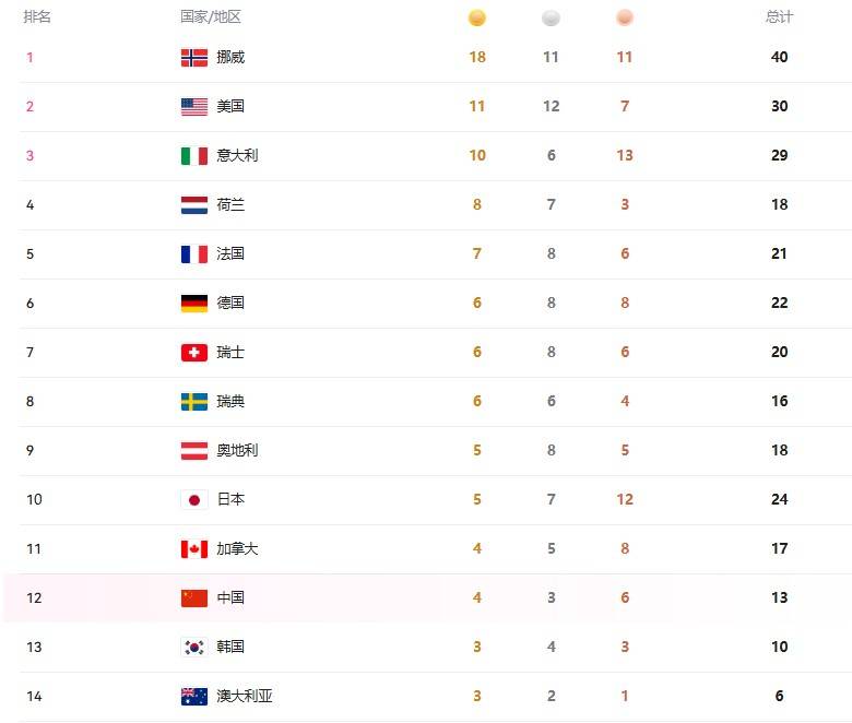 目前中国队在金牌榜上依然还是第12位,4金3银6铜,挪威18金,继续刷新历史的最高金牌数,美国和意大利继续第二和第三,则前三名很久不变了。