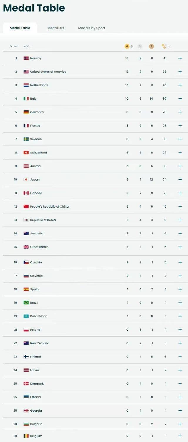 挪威队以18金12银11铜高居第一,且连续4届高居金牌榜第一,也是连续3届高居奖牌榜第一,且18金也创造冬奥会单队单届最多金牌纪录。