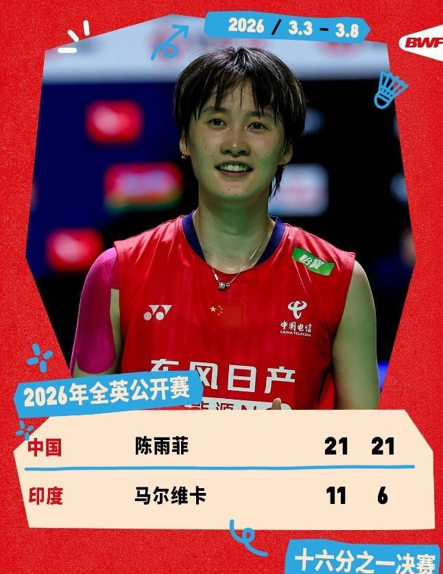 3月3日,世界羽联超级1000赛事全英羽毛球公开赛开打。在女单首轮的一场较量当中,赛会3号种子陈雨菲出战,对手是印度选手马尔维卡。本场比赛陈雨菲兵不血刃,直落两局轻松击败对手,成功闯入16强。