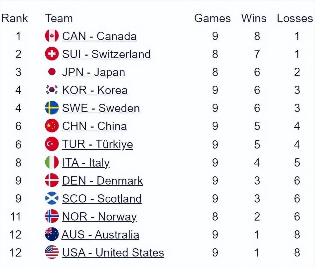 目前加拿大排名第一,瑞士第二,基本都确实了晋级席位,日本上升到第三,韩国虽然连败,依然在前四,中国上升到第六,澳大利亚和美国垫底,都只有1场胜利,只剩下三轮的情况下,已经无缘晋级了。
