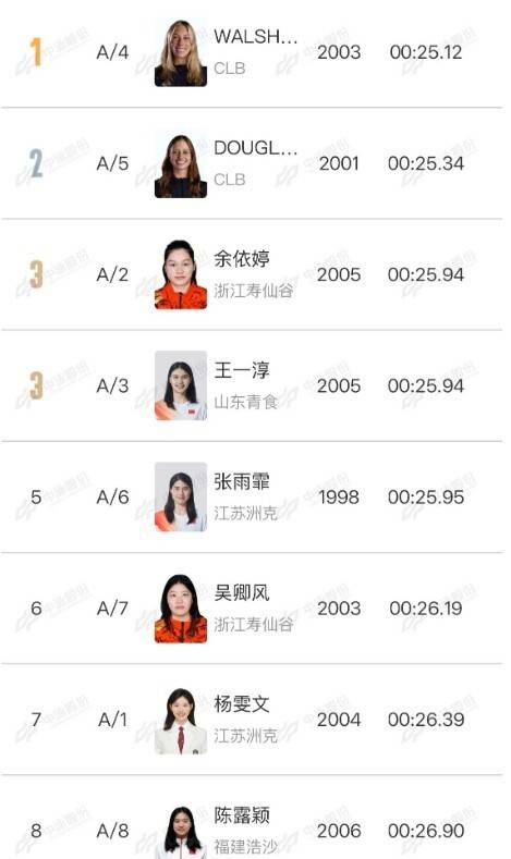 格雷琴-沃尔什以25秒12的成绩获得了冠军,凯特-道格拉斯25秒34获得亚军,余依婷和王一淳成绩同为25秒94并列第3名,张雨霏25秒95排名第5位完赛,6到8名分别是吴卿风、杨雯文和陈露颖。(全景体育)