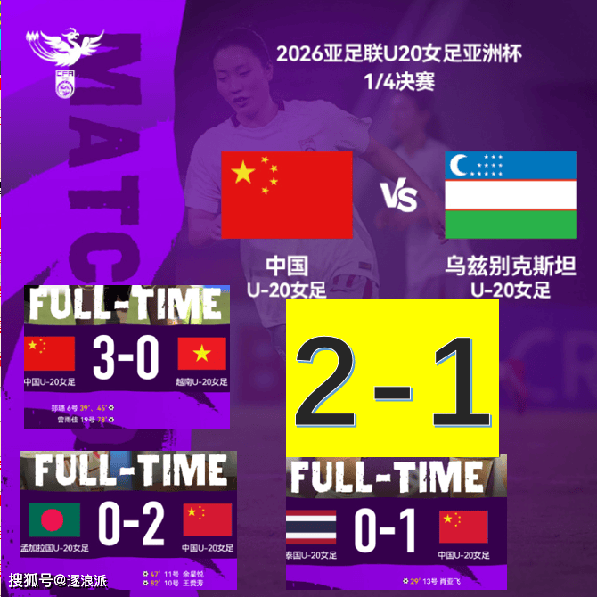 赛后,中国2-1乌兹,全场中超有多次击中横梁、立柱的射门,下半场后30分钟基本没有太多的进攻套路。在率先结束的一场比赛里,日本4-0大胜越南。按照赛程,中国U-20女足将在半决赛对阵日本,取胜难度极大。明天,朝鲜面对澳大利亚,泰国遇到韩国,之后的半决赛将在15号进行,四强球队将直通下半年进行的U-20女足世界杯。