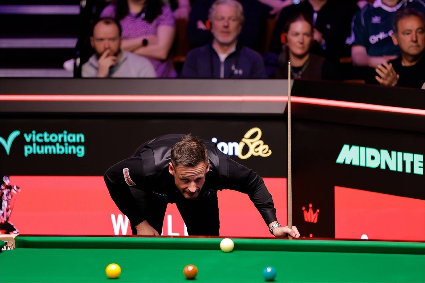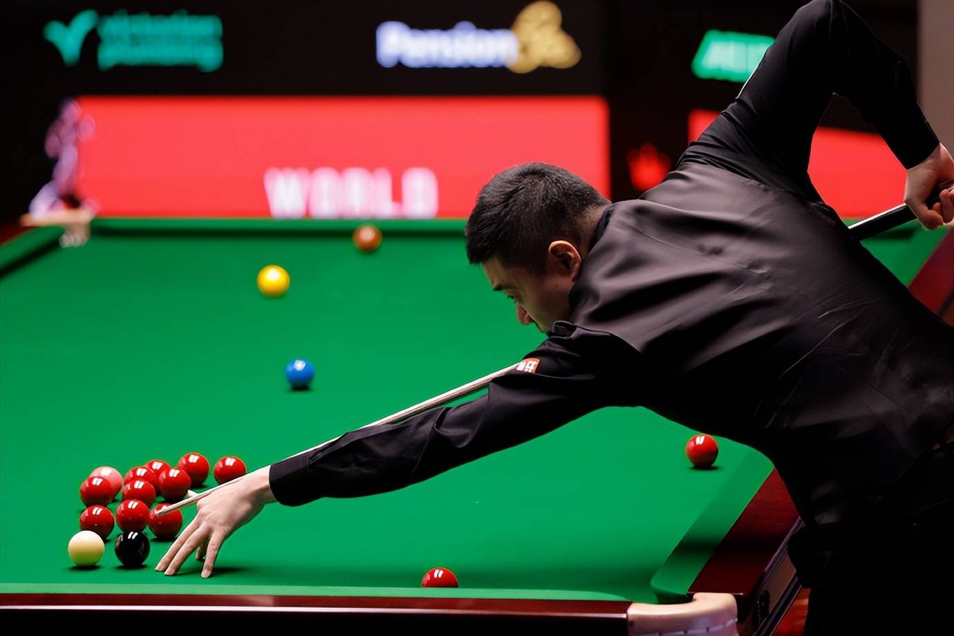 丁俊晖继续围着黑球打 了,高杆打进,丁俊晖轻推蓝球,叫底袋红球。丁俊晖低杆打进黑球,走一库弹回,丁俊晖打进底袋下方右侧红球,叫位黑球。