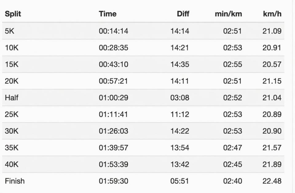 第一个5公里萨维用时14分14秒,平均配速为2分51秒。5到10公里萨维的用时为14分21秒,配速略有下降,来到了2分53秒。10到15公里处,萨维用时14分35秒完成,这是他全场比赛最慢的5公里。半程完赛用时1小时00分29秒,整个前半程萨维的配速平均在2分52秒左右。