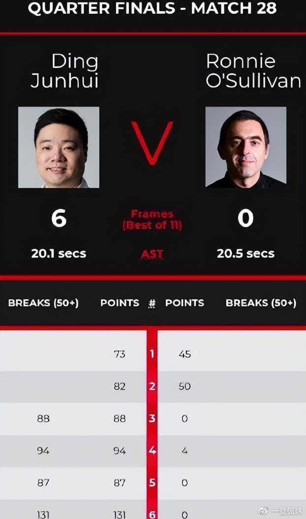 不过,赛事的进程却超乎大多数球迷的想象。除了第一局和第二局,双方打得你来我往,丁俊晖赢得有些惊险外。其余的四局,丁俊晖的表现就是一位顶级巨星,他火力全开,根本就不给奥沙利文任何机会。最后的四局,奥沙利文居然有三局得零分。最后一局,丁俊晖更是打出了单杆131分,直接以6:0横扫奥沙利文晋级四强,目标直指冠军。