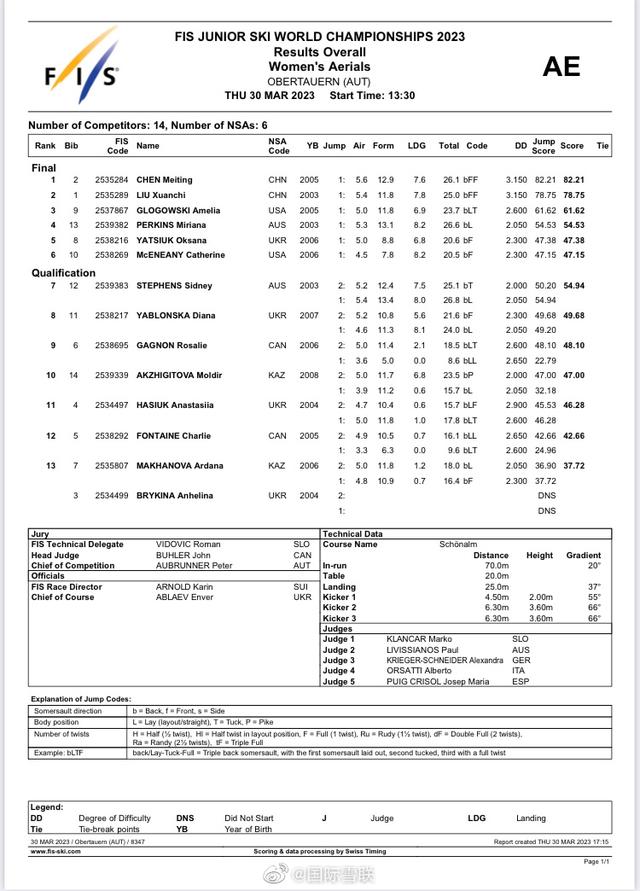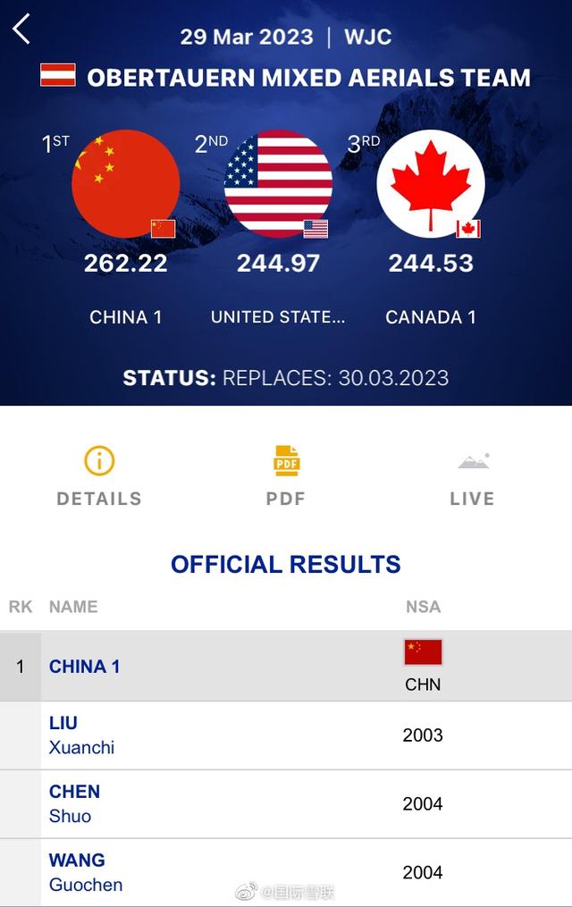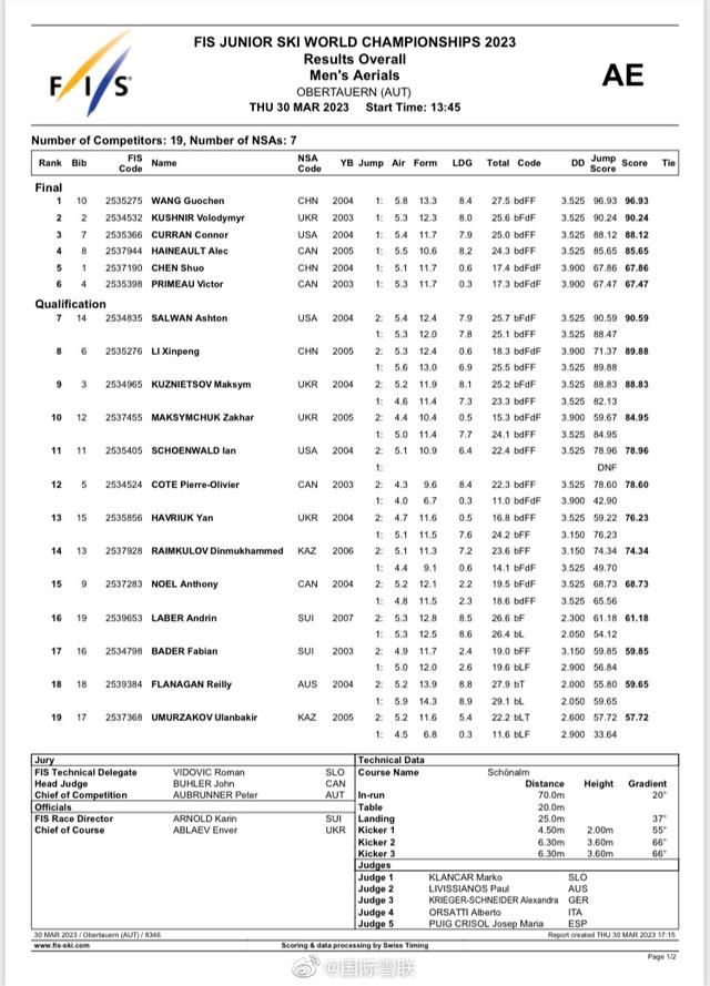 在奥地利上陶恩进行的2023年世界青年自由式滑雪空中技巧锦标赛上,中国队包揽全部三个项目金牌。