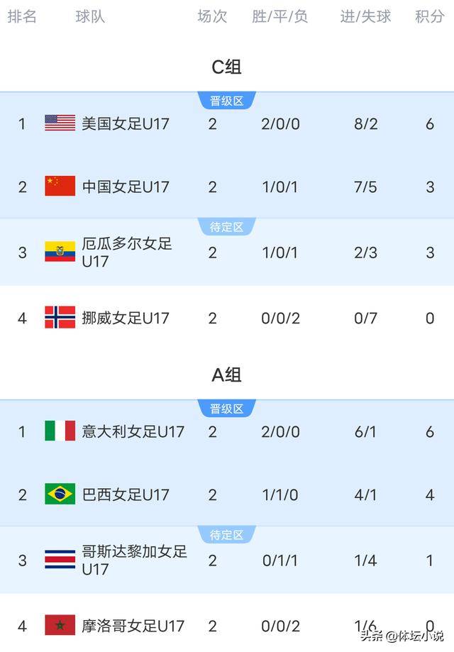 北京时间10月22日,U17女足世界杯小组赛第二轮开打,在昨天结束了6场对决,其中神秘之师朝鲜女足2-1力擒喀麦隆女足,哥斯达黎加女足1-1爆冷与巴西握手言和,美国女足火力全开以5-2大胜中国女足,挪威女足0-2不敌厄瓜多尔女足,荷兰0-1惨遭墨西哥女足绝杀,东道主摩洛哥女足兵败如山倒以1-3输给了意大利女足。目前在最新的积分榜上,美国,巴西,朝鲜三队排名榜首。中国女足位居第二!