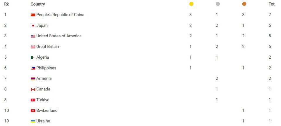 总奖牌榜方面,中国队3金1银3铜位列榜首,日本队2金2银2铜排名次席,美国队2金1银2铜排名第3位,个人中立运动会2金1银1铜排名第4位,另外3个获得金牌的队伍分别是英国、阿尔及利亚和菲律宾。(全景体育) |